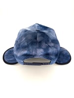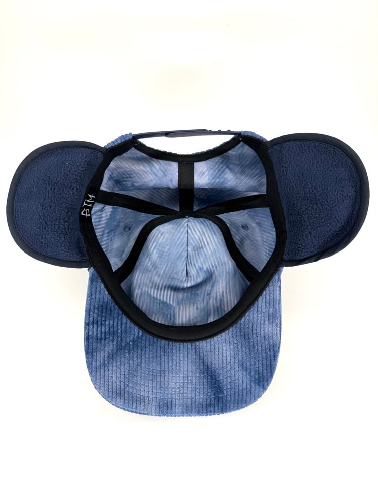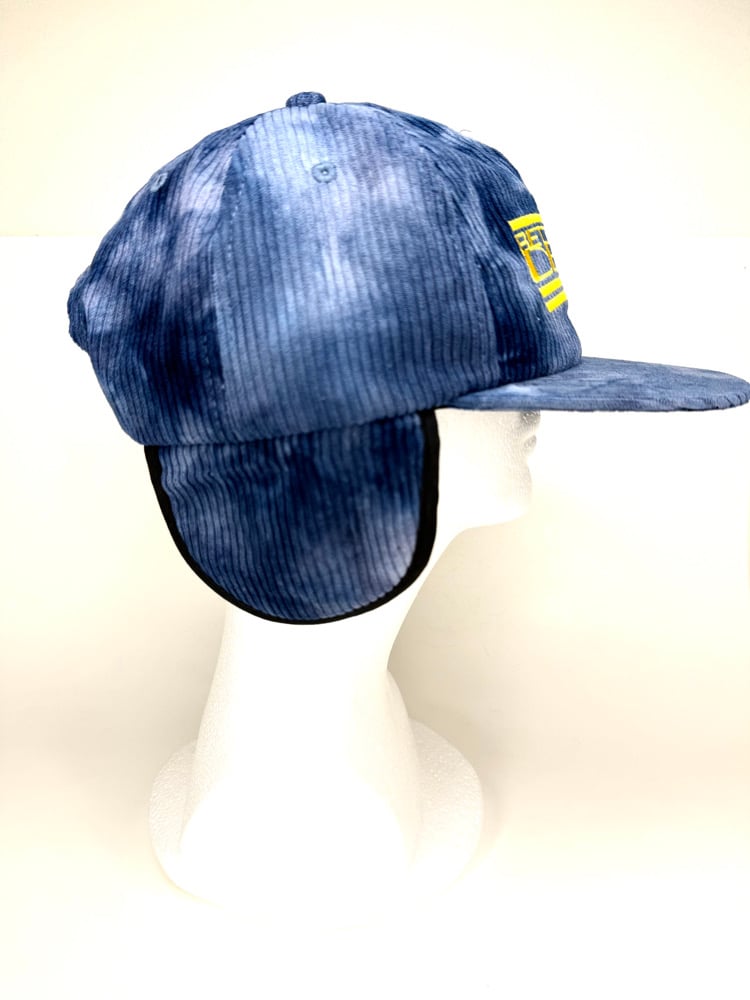 Custom made, unstructured, medium profile, flat brim (can be bent). Blue/white/and small traces of purple tie dyed, medium wale corduroy with yellow embroidered design, corduroy exterior/polar fleece lined interior ear flaps, snapback closure. Tie dye will vary from hat to hat (the one you receive may vary from one shown). Cut & sew, only 50 made ๐๐นโก๏ธ