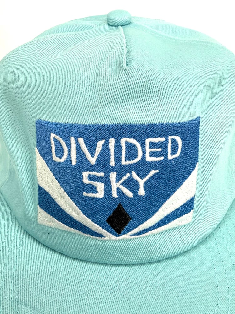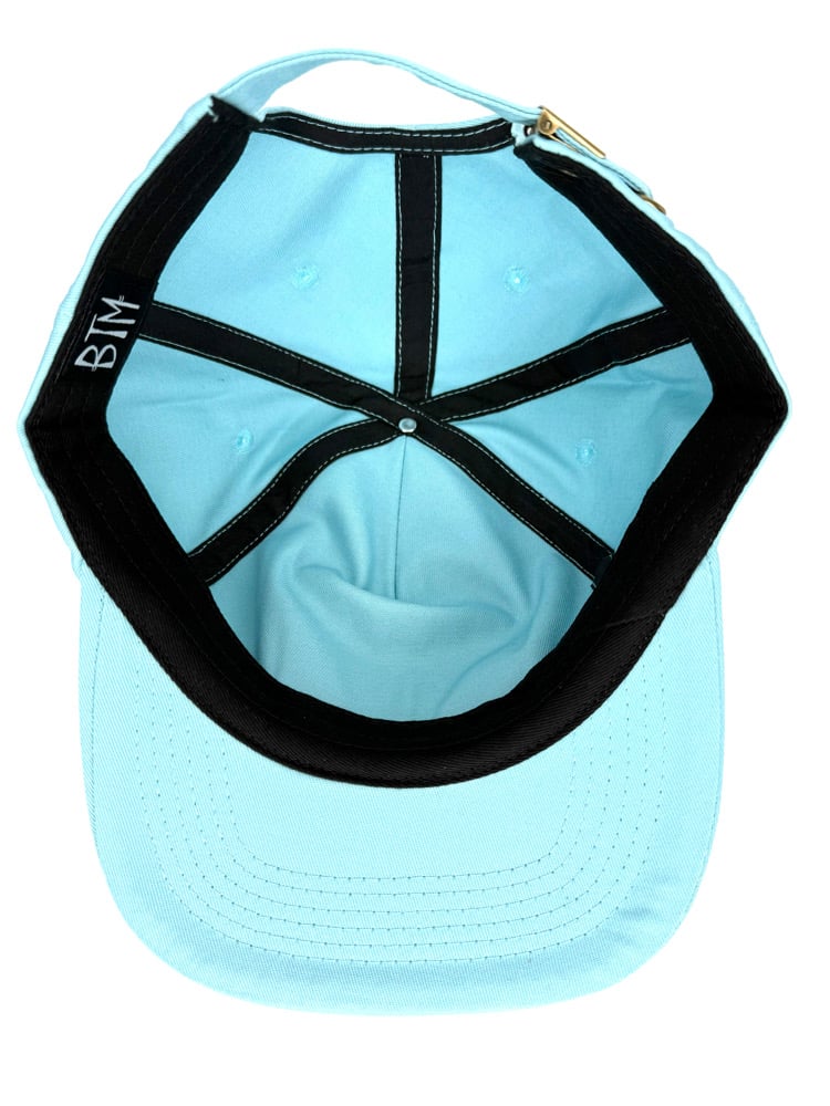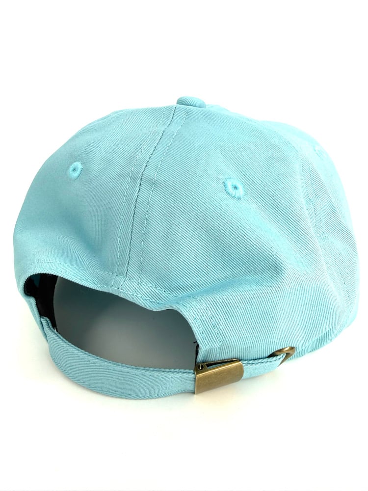 Custom made, unstructured, medium profile, flat brim (but can be bent) high quality, baby blue twill/embroidered design. Twill strap closure w/ brass clamp. Cut & Sew, 100 made💀🌹⚡️