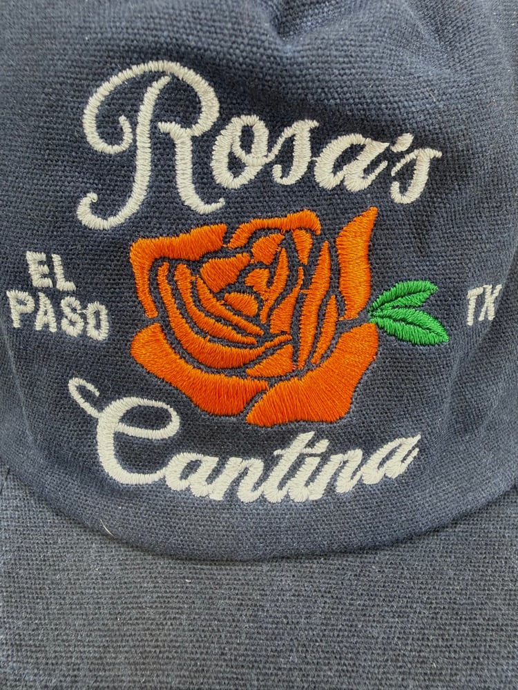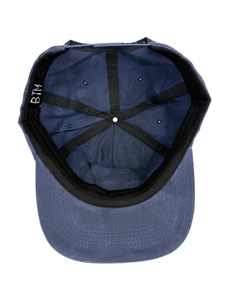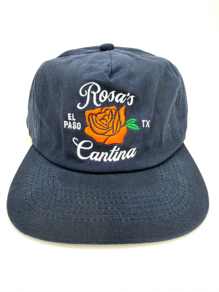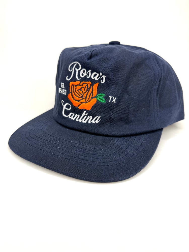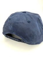 Custom made, unstructured, medium profile, flat brim (can be rolled), high quality, navy blue water resistant, waxed canvas with matching snapback adjustable strap. Orange embroidered rose. Distressing in canvas is normal. Cut & sew, 50 made ๐๐นโก๏ธ