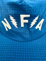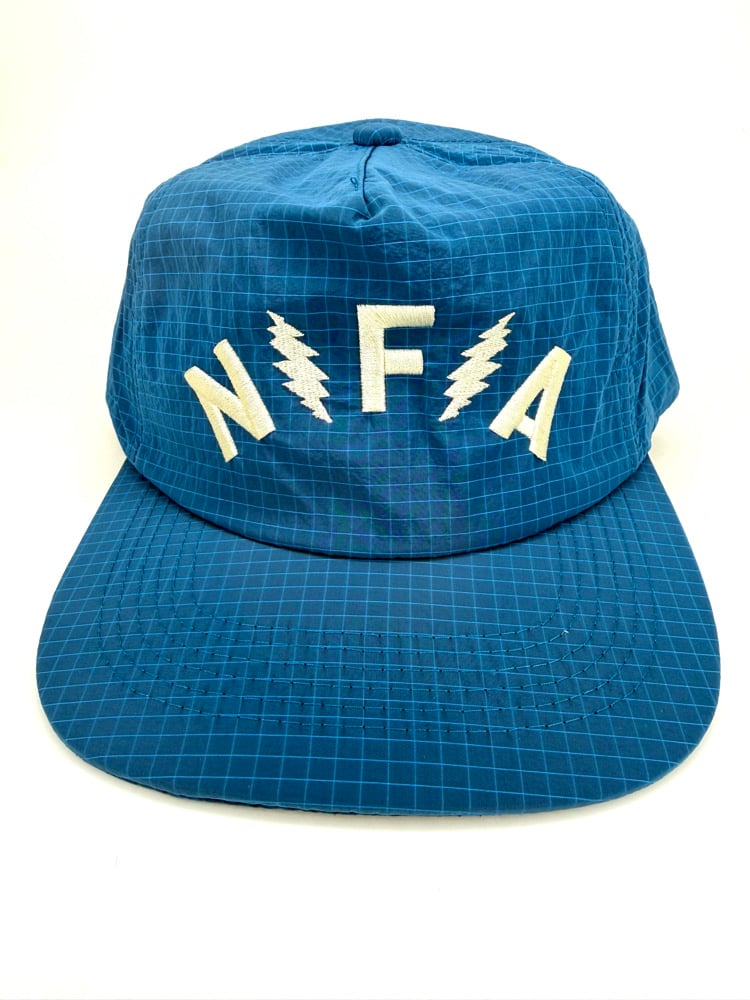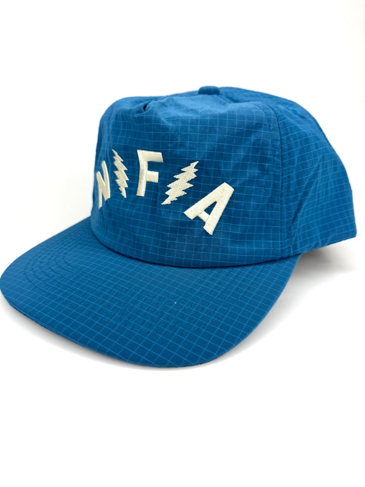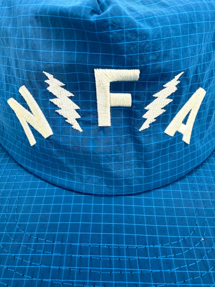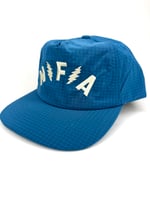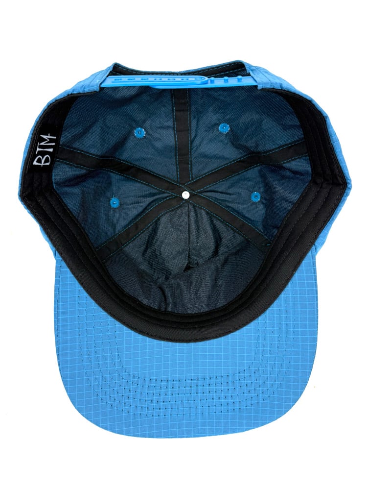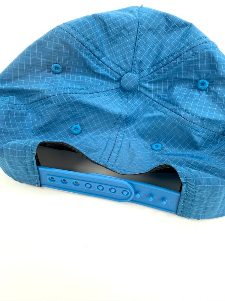 Custom made, medium profile, unstructured, flat brim (can be easily rolled), blue, quick drying, water repellent, rip stop nylon. Interior mesh gauze lining, embroidered design, blue snapback closure. Cut & Sew, 25 made ๐๐นโก๏ธ