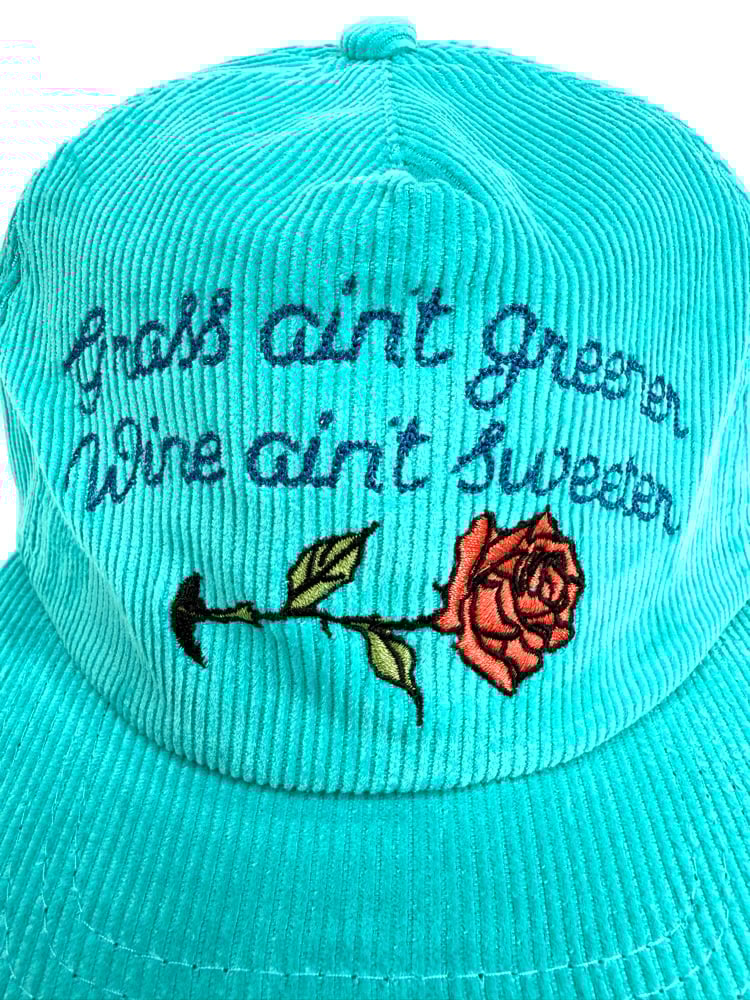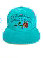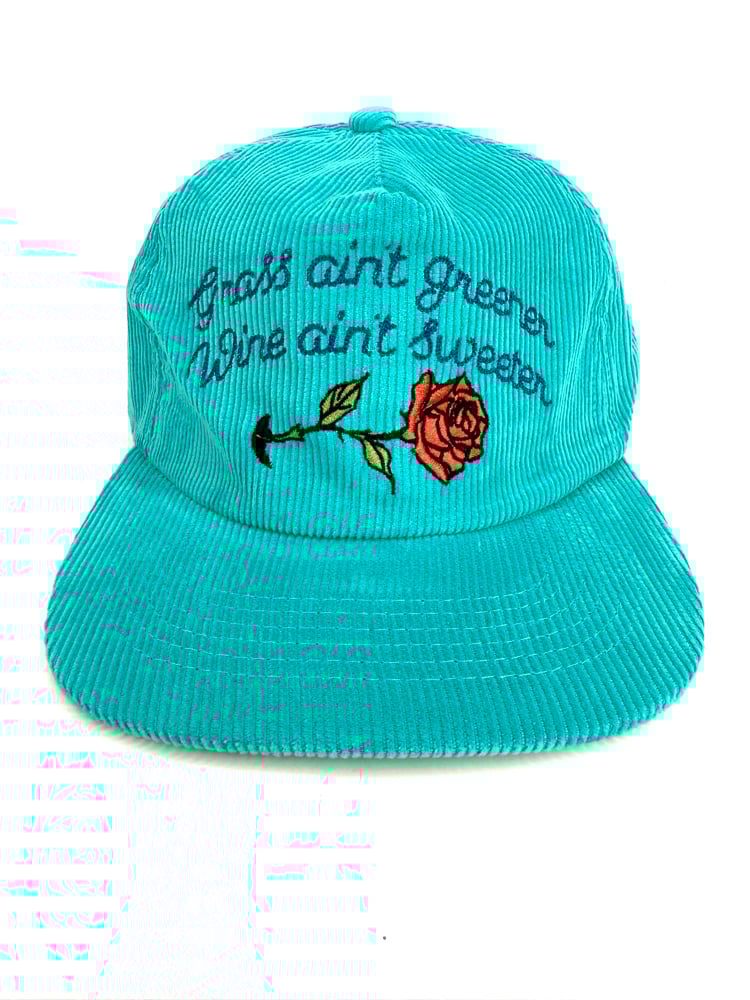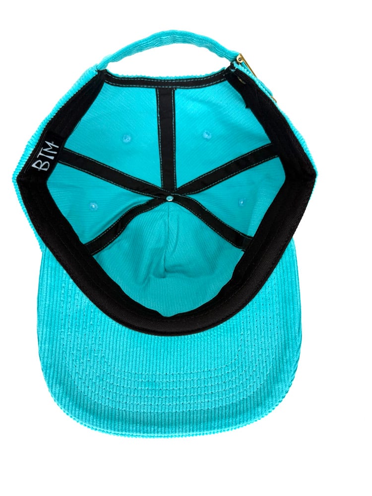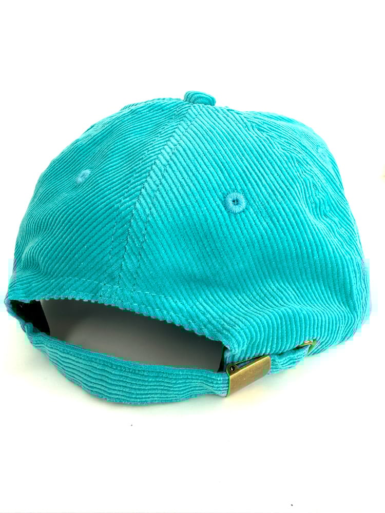 Custom made, unstructured, medium profile, flat brim (can be bent). Teal corduroy hat with embroidered design, corduroy adjustable strap closure. Cut & sew, 50 made ๐๐นโก๏ธ