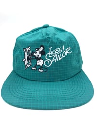 Custom made, medium profile, unstructured, flat brim (can be rolled), green, quick drying, water repellent, rip stop nylon. LOST SAILOR embroidered design, white snap back adjustable strap. Cut & Sew, 100 made ๐๐นโก๏ธ